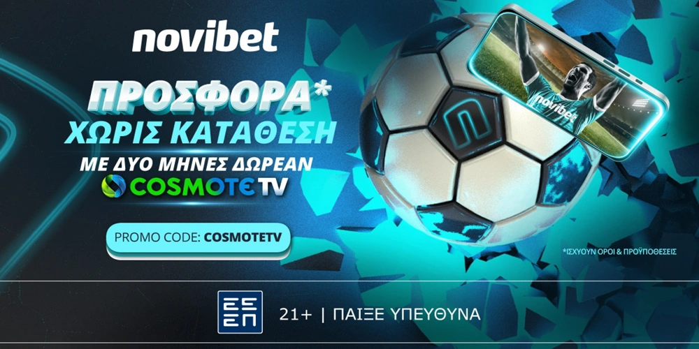 Ξεκλείδωσε όλο το αθλητικό περιεχόμενο της Cosmote TV, χρησιμοποιώντας τον κωδικό «COSMOTETV», μέσα από την προσφορά γνωριμίας* της Novibet.*ΙΣΧΥΟΥΝ ΟΡΟΙ & ΠΡΟΫΠΟΘΕΣΕΙΣ ΔΙΑΘΕΣΙΜΟΙ ΣΤΟ NOVIBET.GR/INFO/OROI