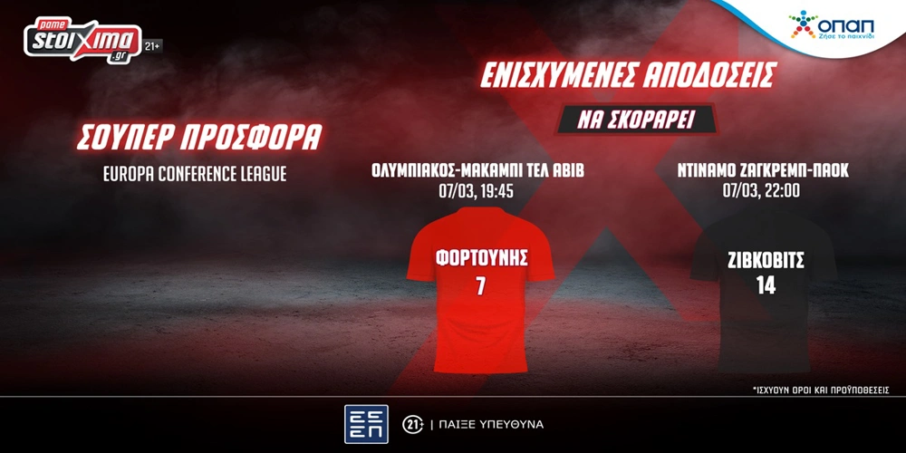 Οι «ερυθρόλευκοι» υποδέχονται στο «Γ. Καραϊσκάκης» την ισραηλινή ομάδα (07/03, 19:45), ενώ ο «δικέφαλος του Βορρά» φιλοξενείται στην έδρα της κροατικής ομάδας (07/03, 22:00). Στο Pamestoixima.gr βρίσκεις πολλές στοιχηματικές επιλογές για τους αγώνες του Ολυμπιακού και του ΠΑΟΚ, αλλά κι ενισχυμένες αποδόσεις: Ολυμπιακός-Μακάμπι Τελ Αβίβ (07/03, 19:45): • Σκορ Πολλαπλών Επιλογών 1-0, 2-0 ή 3-0 στο 3.20* • Φορτούνης Να Σκοράρει στο 3.05* • Bet Builder Ready Να Σκοράρουν και οι δύο ομάδες σε οποιοδήποτε ημίχρονο στο 2.45* • Bet Builder Ready Ολυμπιακός να κερδίσει & Ελ Κάαμπι να σκοράρει οποιαδήποτε στιγμή στο 2.90* • Bet Builder Ready Γιόβεβιτς να σκοράρει οποιαδήποτε στιγμή, Ολυμπιακός να κερδίσει & να σκοράρουν κι οι δύο ομάδες στο 5.75* Ντιναμό Ζάγκρεμπ-ΠΑΟΚ (07/03, 22:00): • Σκορ Πολλαπλών Επιλογών 0-1, 0-2 ή 0-3 στο 5.60* • Ζίβκοβιτς Να Σκοράρει στο 4.30* • Bet Builder Ready 0-0 ισοπαλία σε οποιοδήποτε ημίχρονο στο 2.03* • Bet Builder Ready Ντιναμό Ζάγκρεμπ να κερδίσει & Πέτκοβιτς να σκοράρει οποιαδήποτε στιγμή στο 4.30* • Bet Builder Ready ΠΑΟΚ να κερδίσει & Τόμας να σκοράρει οποιαδήποτε στιγμή στο 6.25* Επιπλέον, σε περιμένει σούπερ προσφορά* για τα παιχνίδια των ελληνικών ομάδων στο Europa Conference League, ενώ τα βρίσκεις και με 0% γκανιότα**, για να απολαύσεις τη δράση στο έπακρο!Στο Pamestoixima.gr ζεις όλη την αθλητική δράση με σούπερ ενισχυμένη τριπλή προσφορά* χωρίς κατάθεση!