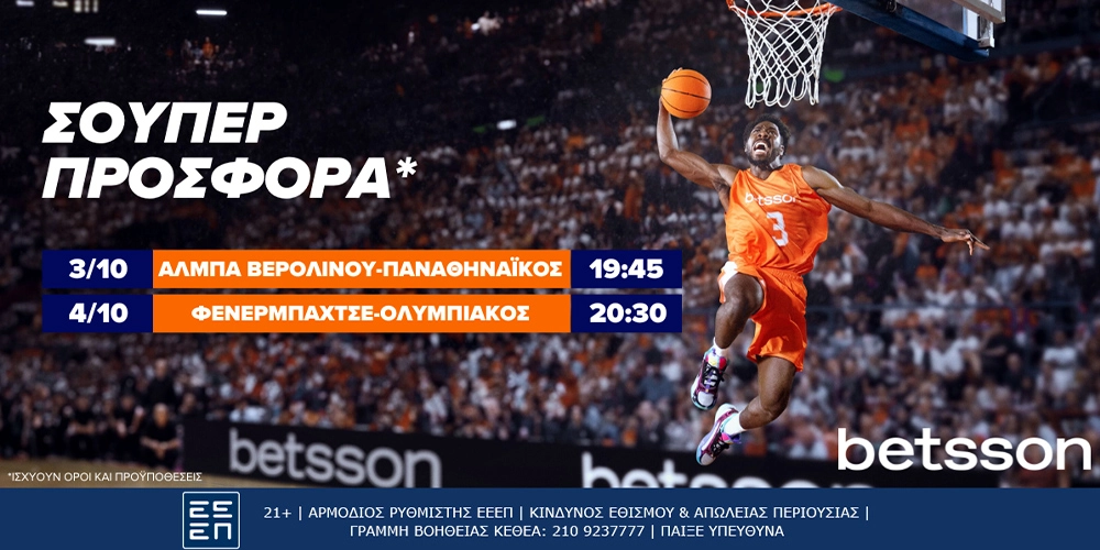 Στην Betsson θα βρείτε μία σούπερ προσφορά* για τους αγώνες Άλμπα Βερολίνου – Παναθηναϊκός και Φενέρμπαχτσε – Ολυμπιακός, για να ξεκινήσει καλά η σεζόν!